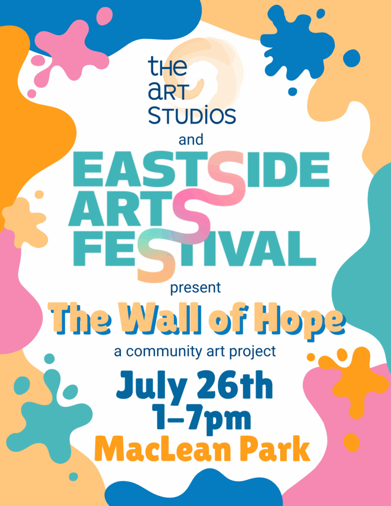 The Art Studios will host an information booth to share who we are and what we do, while inviting participants to contribute to our community art project, The Wall of Hope. This collaborative piece will be created during the Eastside Arts Festival and later displayed in The Art Studios’ window. Come be a source of encouragement to the community through your contribution to the piece!