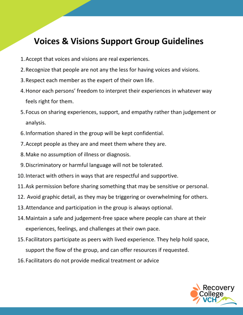 Voices & Visions Support Groups are intended as safe(r), supportive spaces where people can speak openly about their experiences without fear of judgment, exchange strategies and ideas, and build community.